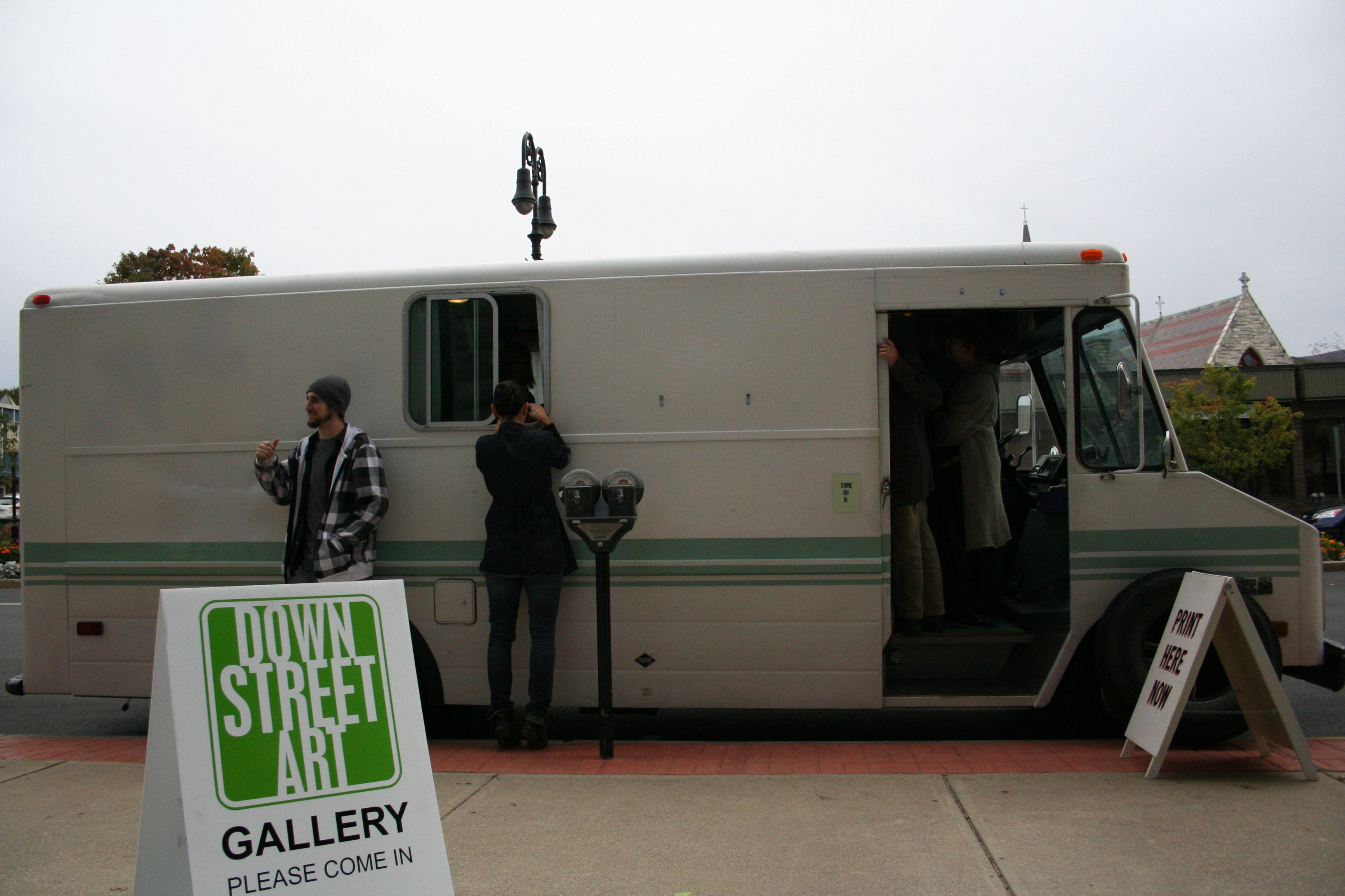 Kyle Durrie’s Type Truck arrived at 105 Main St. today and prints were made! Melanie had one of her classes come down to the arrival, listened to Kyle tell her story with the truck, and then Kyle had everyone collaborate on a print right in the truck!
