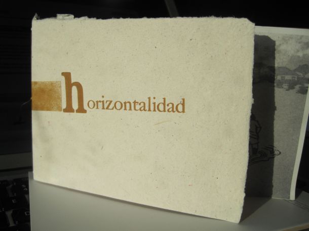 The colophon reads: Book Bombs Zine #6 was completed in October 2011, concurrent with Occupy Wallstreet and the Occupy Together actions across the country, in conjunction with the Friends of the Dard Hunter Annual Meetings. It’s a great book that shows ways Horizontalidad is happening in America. We learn in the zine that Horizontalidad is from Argentina, “a word that arose from autonomous movements , indicating a lack of hierachy and a level playing field, it was a practive of decentralizing supremacy and self-organization, where all participants were part of the decision-making processes.” Sounds a lot like the Occupy movement, doesn’t it.