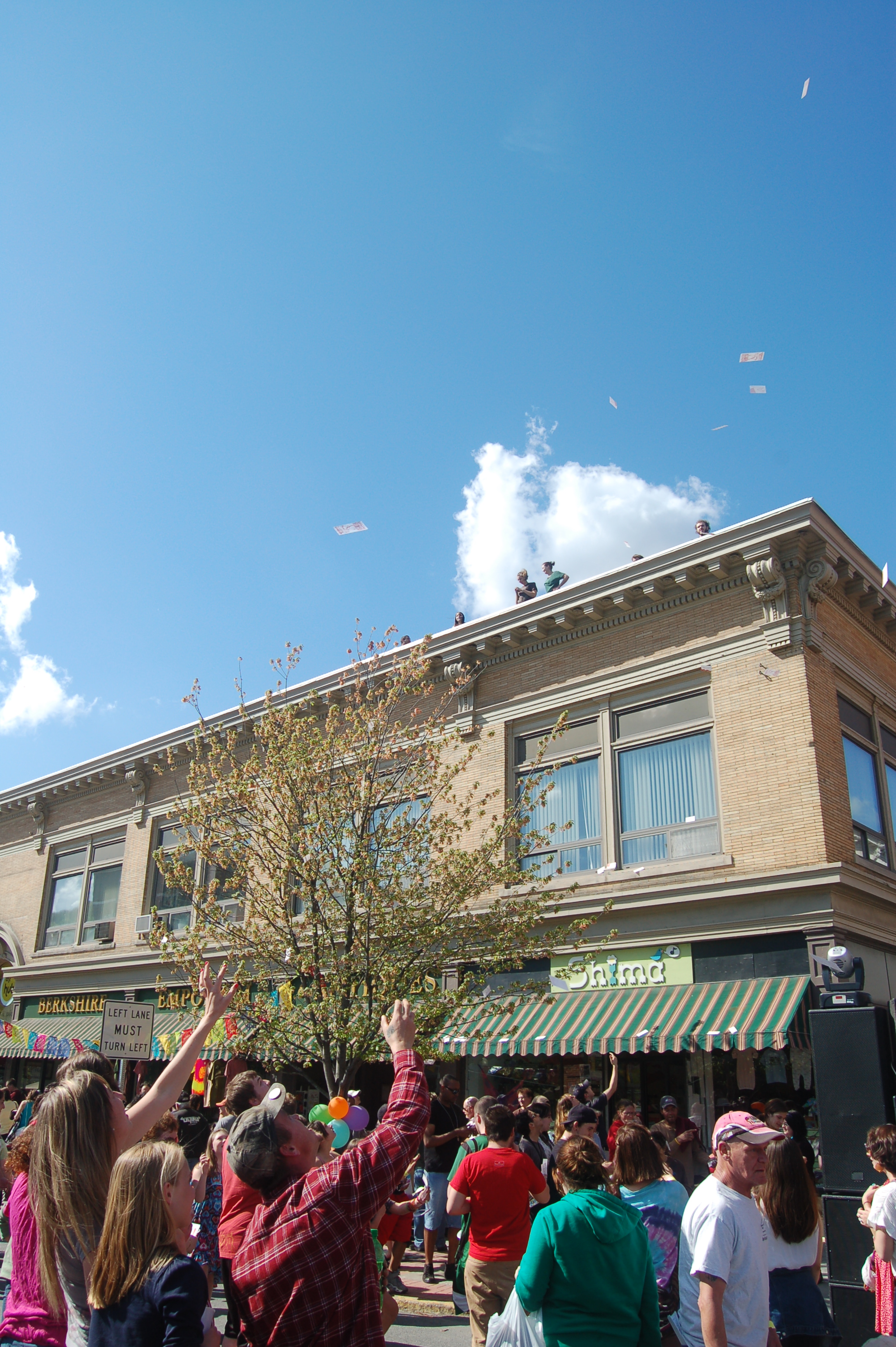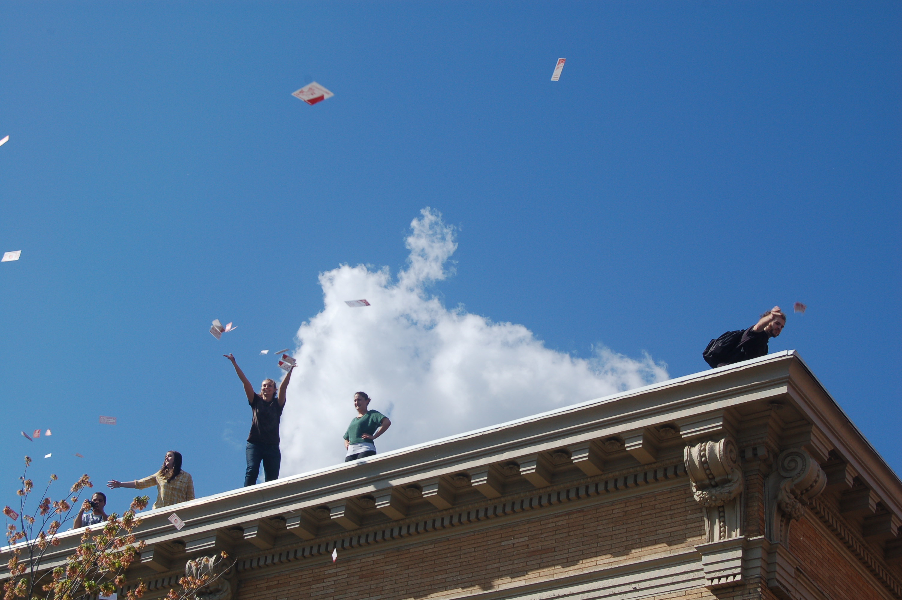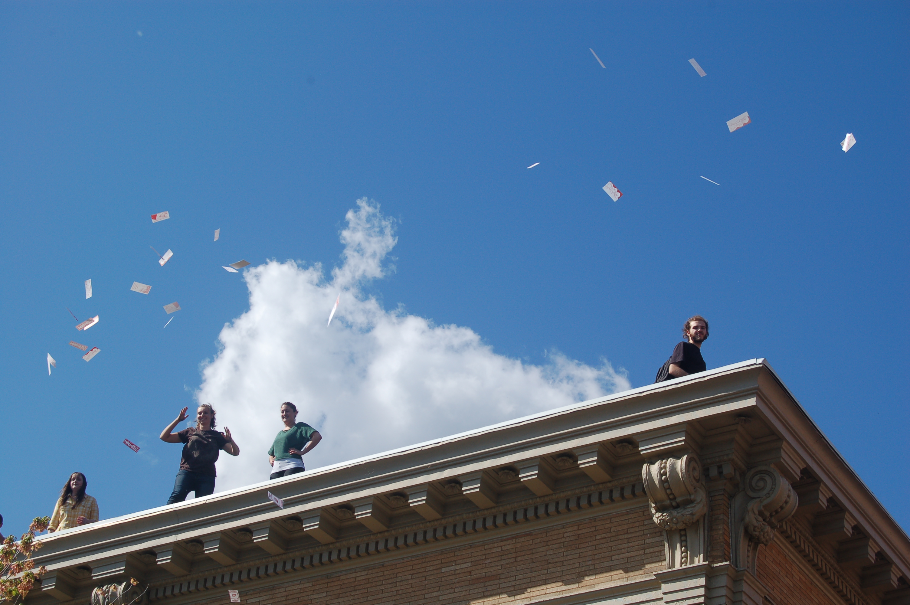 Then at 4 p.m. five of my students, Marli LaGrone, Damian Gordon, Alberto Roman, Stephanie VanBramer and Adriana Alexatos went up to the roof of the building on the corner of Main and Holden and threw the leaflets out to the crowds below. What a fun way to end the semester!