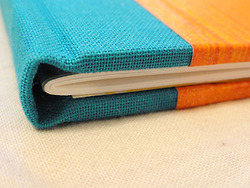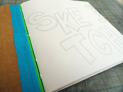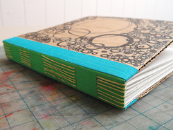 DIY Sketchbook: The book that started Book of the Week Club.Upcycled cardboard and paper, with book tape and waxed thread.A day meant for cleaning the shop turning into a day of bookmaking and no cleaning, with this sketchbook as the result. The signatures are sewn directly into the spine of the book, showcasing the stitches on the outside. Colored book tape was used to hold the skeleton of the book together rather then a whole sheet of book cloth. Gotta show off that cardboard.
