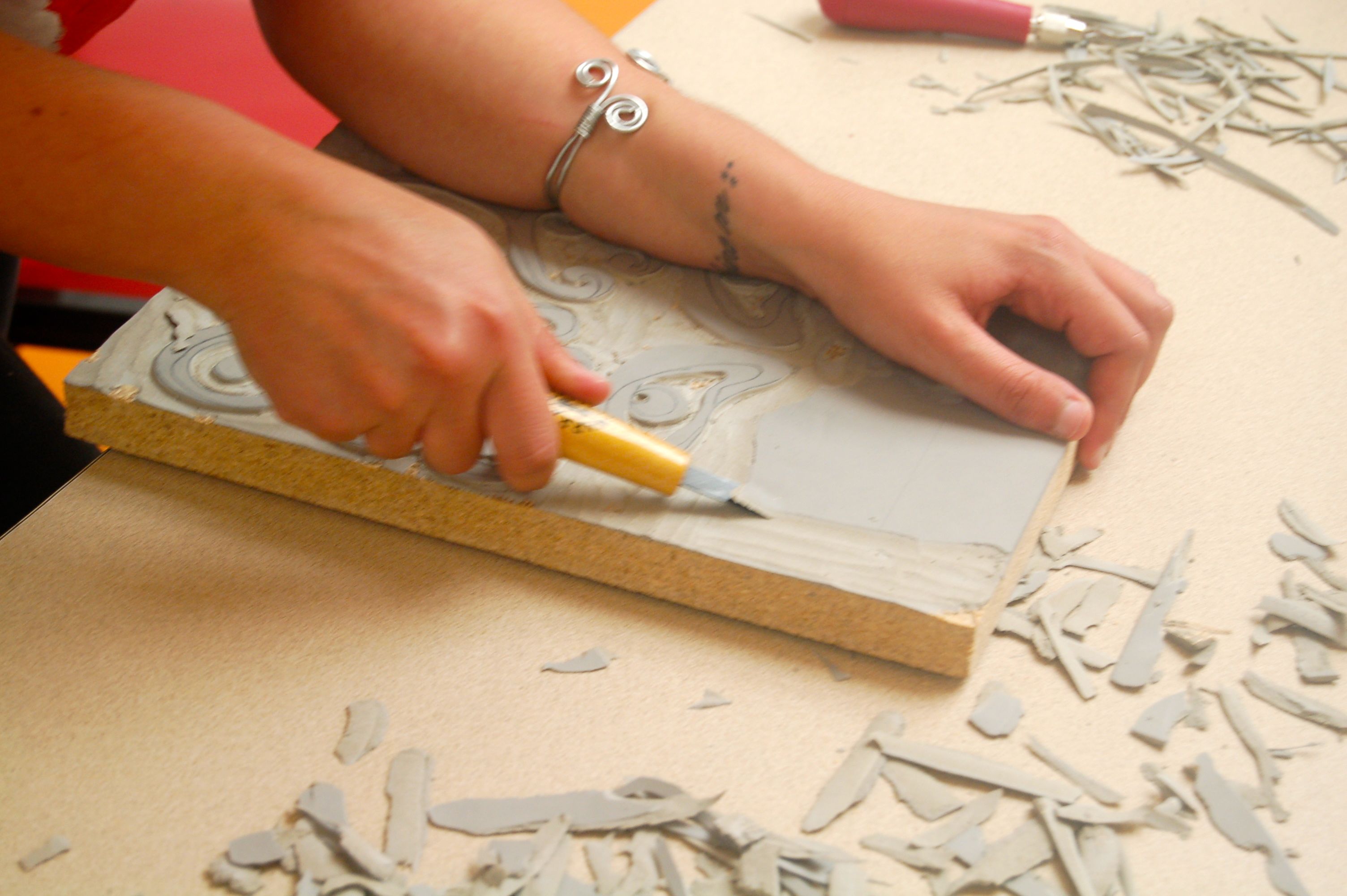 In this week’s edition of “Experimental Letterpress,” we have ventured into the world of linocuts! A linocut is a printmaking technique (a variant of woodcut) in which a sheet of linoleum (sometimes mounted on a wooden block) is used for the relief surface. A design is cut into the linoleum surface with a sharp knife or linoleum cutter which produces a mirrored image onto a sheet of paper when printed.