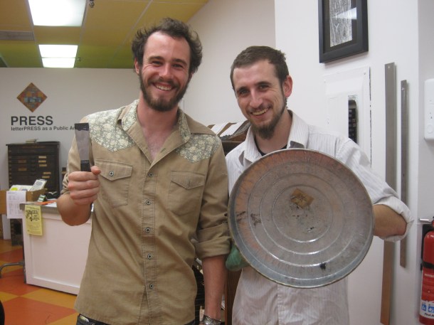 President of MCLA, Mary Grant stopped by and Andy taught her how to print on the Vandercook! (Go Andy!)