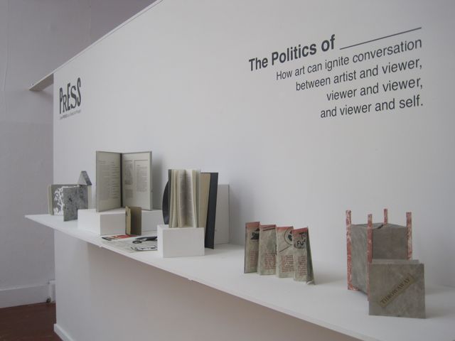 The Politics of ____ examines how art can ignite conversation between artist and viewer, viewer and viewer and viewer and self. The works exhibited move beyond what is assumed when thinking about political art. The show is PRESS’ first ever Call for Entries exhibition. Ten submissions were selected from a very competitive pool of entries resulting in a show that features eleven different artists from as far as Washington State and as near as Church Street, North Adams. See the gallery binder for additional artist information.