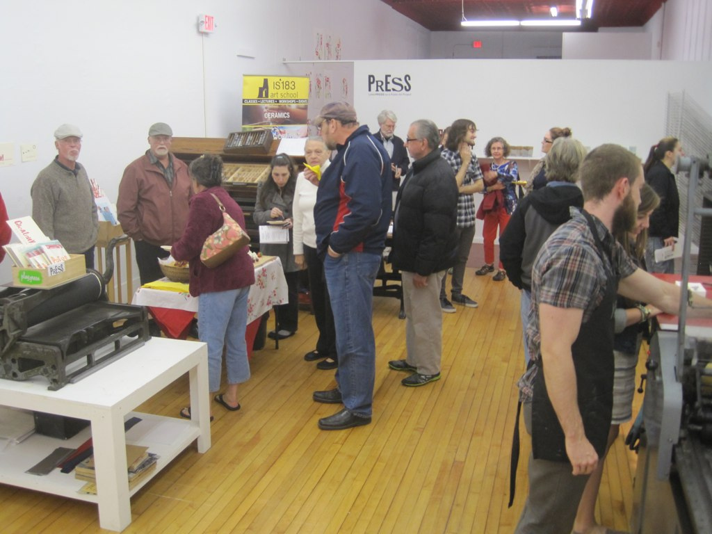 We had another fun filled opening night. “Markings” is an exhibit showcasing work made here at PRESS, which includes work by interns and volunteers Adriana Alexatos, Hayley Parker, Antoine Scalbert, and Leeya Jackson, as well as PRESS founder Melanie Mowinski. We also have a line of postcards that were made by participants from our “Make Your Own Mantra” workshops. Adriana and Hayley were able to come help out with event, while current intern Jonas ran the Vandercook. Also, a special shout out to Shanti Sponder for creating the kickin’ pompoms that are on display in our window.