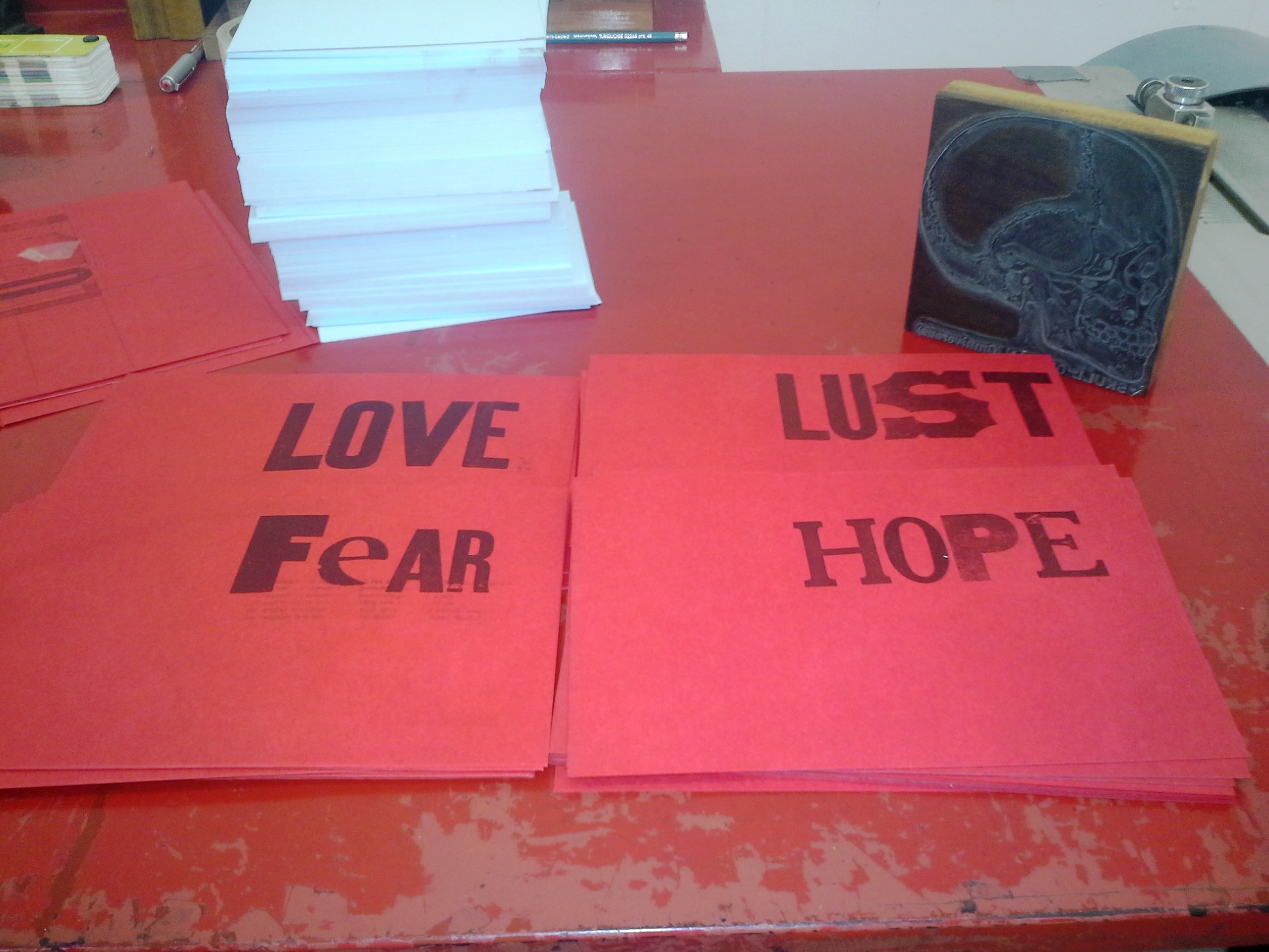 So, our press stopped working on us. Why, Vandercook, WHY?! We were in the middle of printing postcards for the Tricks of the Trade Seminar: Word Becomes Art, Art Becomes Word panel discussion, and the cards were turning out swimmingly until the press decided it didn’t want to move anymore. We were going to pair the cards with the skull block to display how words can impact images and make new meaning. Now, the card represent how we feel about the press. We hope for the best, and we fear what is wrong with it because we love our Vandercook (okay, so lust doesn’t fit in too well). Wish us luck as we try to get our press back in fighting shape.
