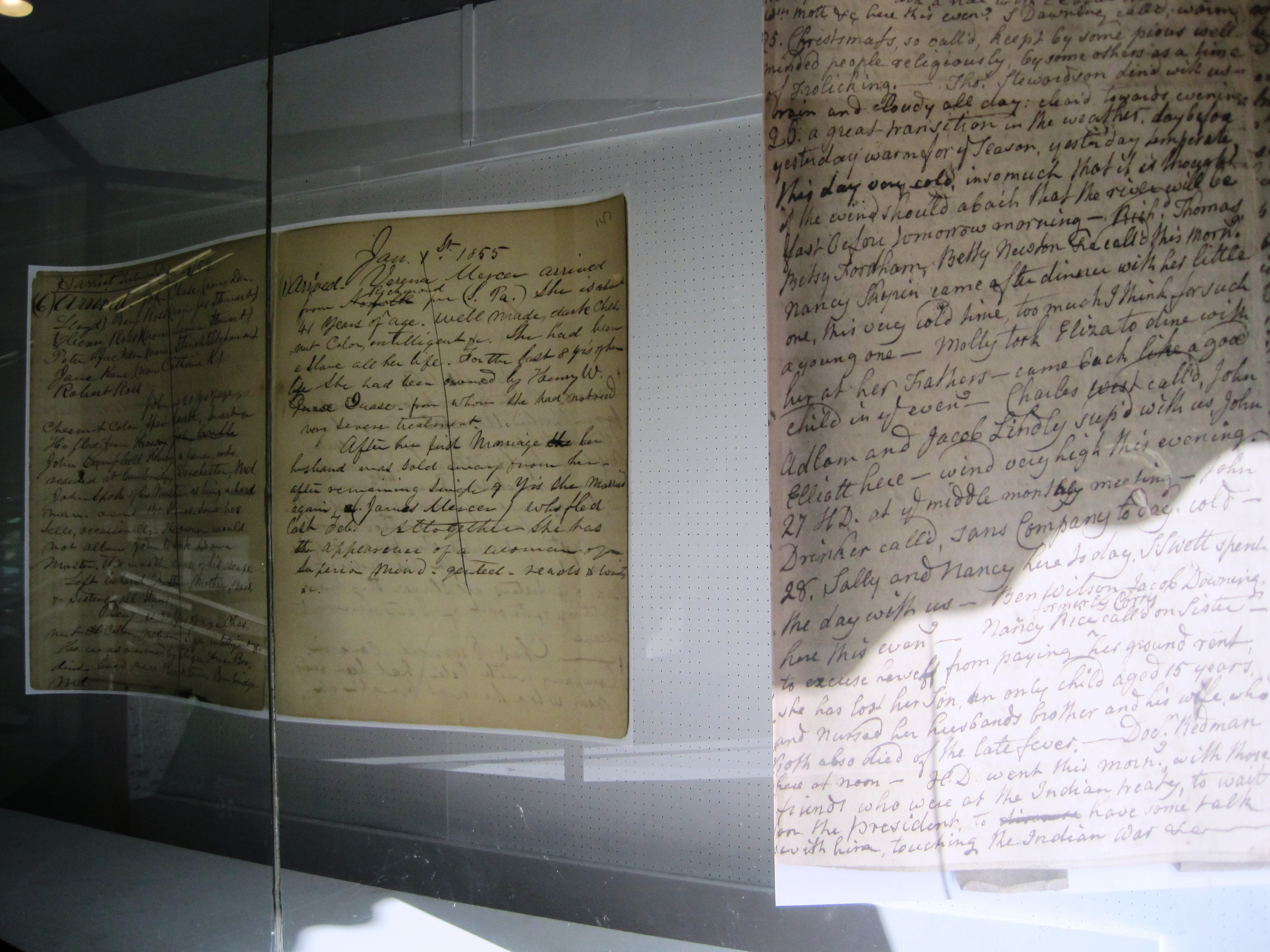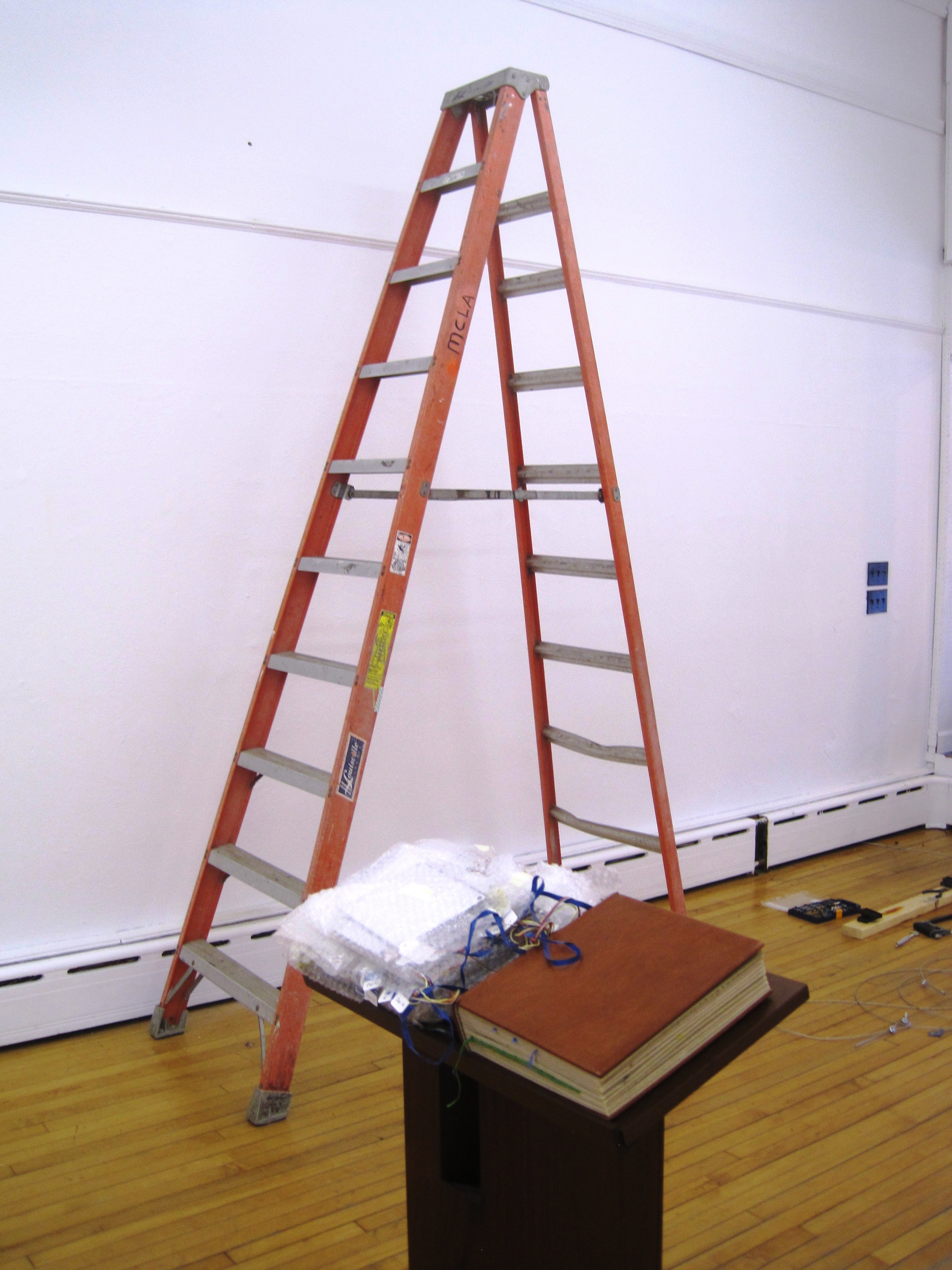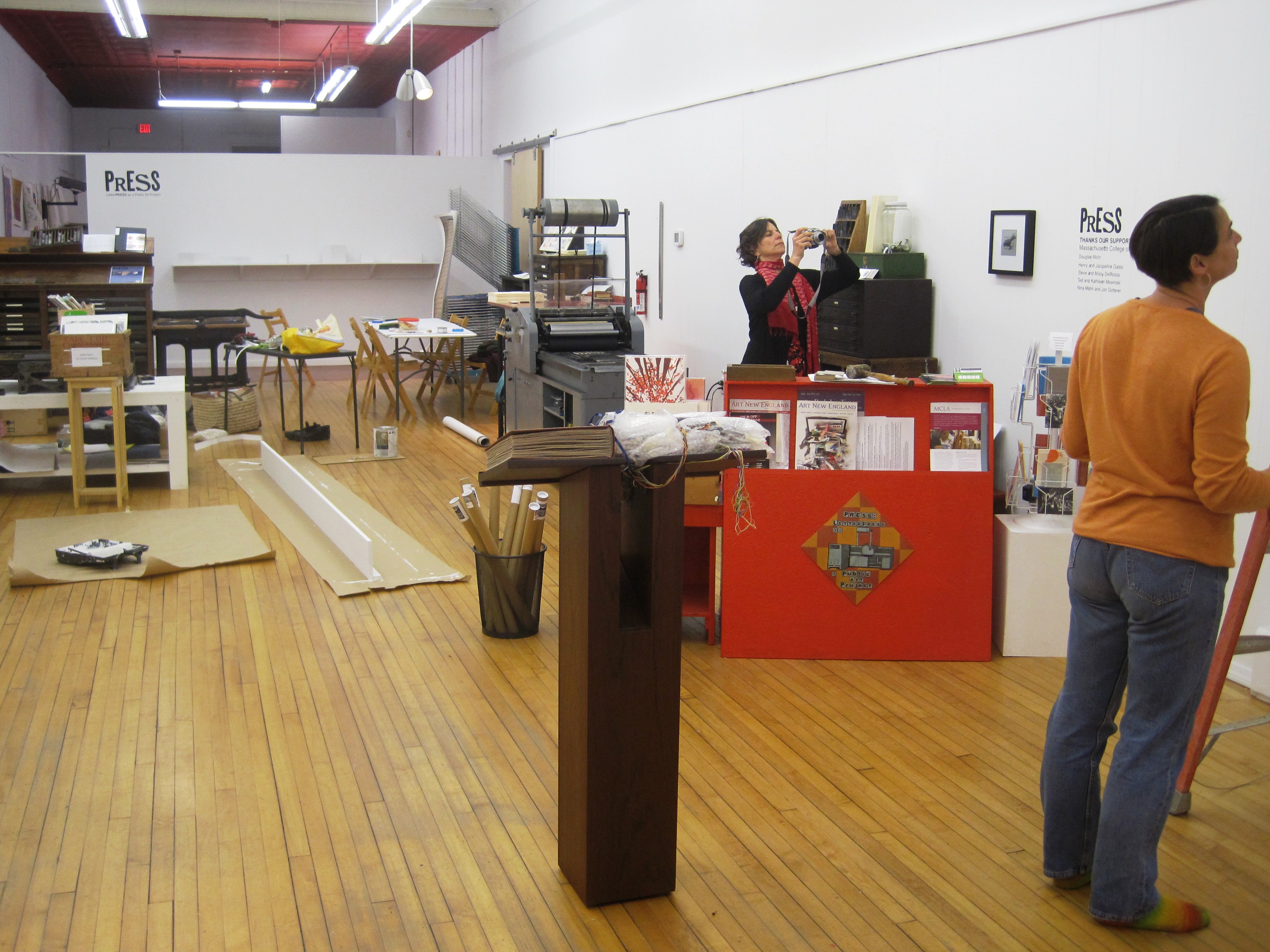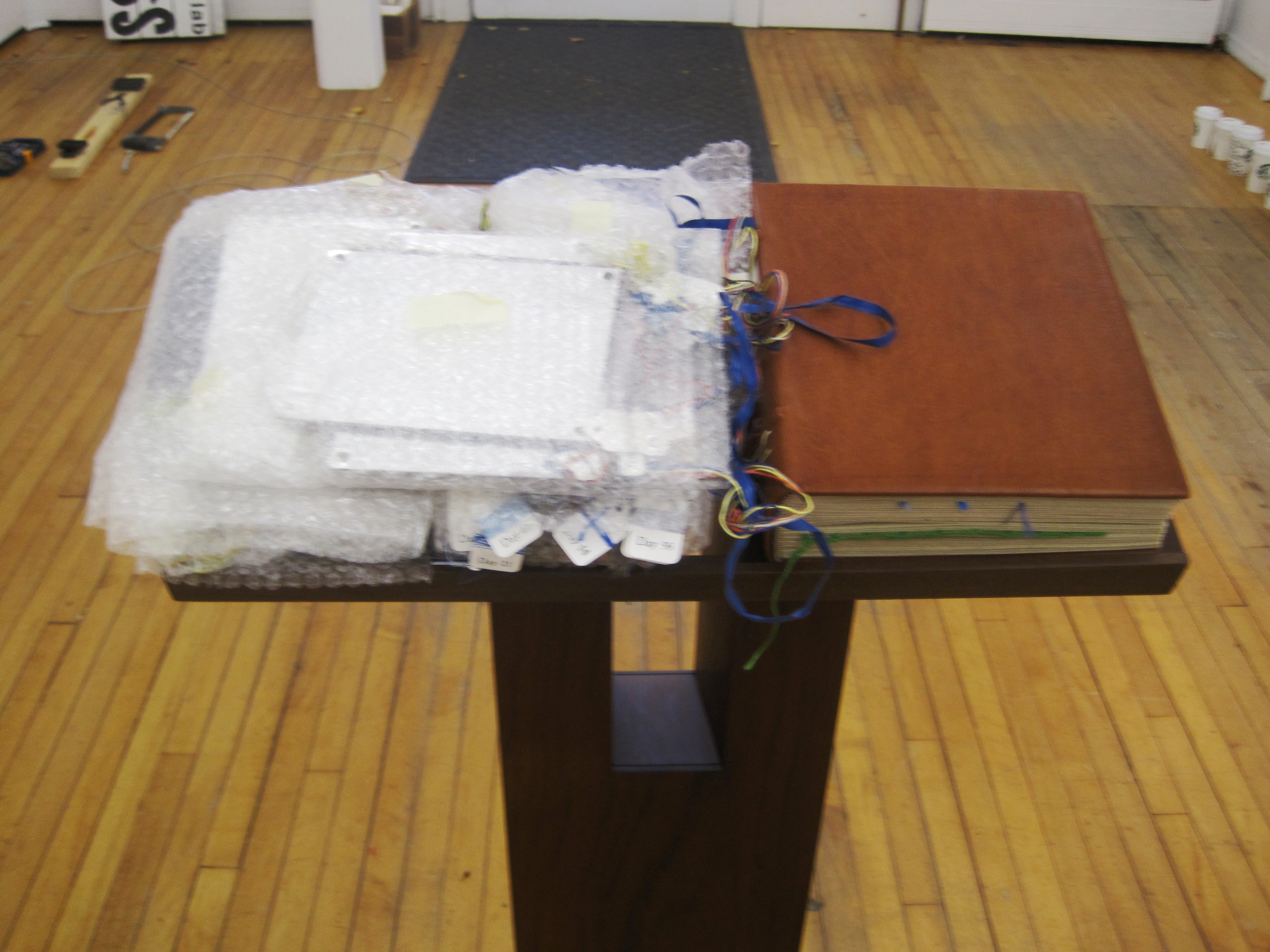 We’re on day three of set-up for The Datum Chronicle, which features the work of book artist Tara O’Brien. We’ve suffered a couple of bumps along the way, like old walls that don’t like new shelves, which has lead to multiple trips to the hardware store. That being said, we’re getting there. We were able to get up Tara’s most epic piece, The Diary Project #1, thanks to the help of Andrew Davis. It is a must see piece, which is good, because you won’t be able to miss it. Check it out at the opening, Thursday, October 31st, from 5-8 pm.