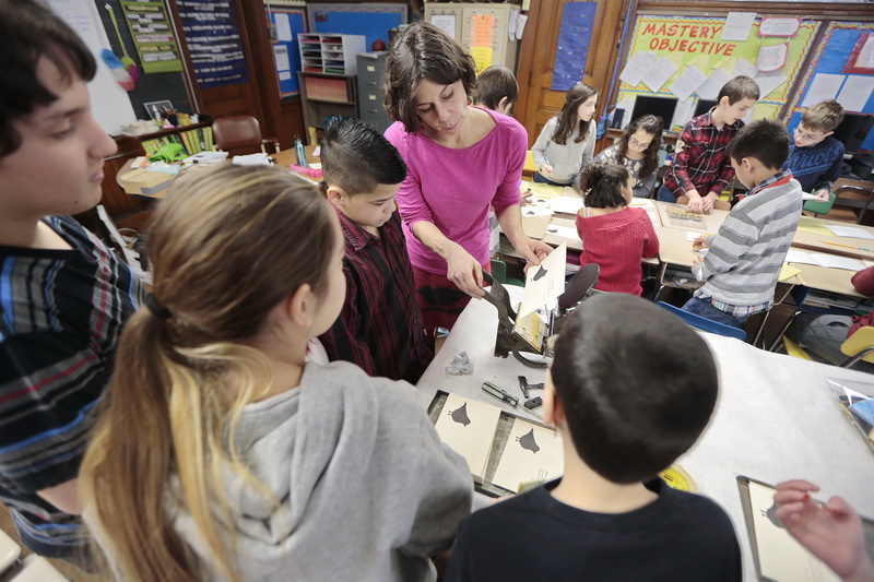 printmaking Published March 2, 2014 at 800 × 533 in Have Presses, Will Travel ← Previous Next → New Bedford Public Schools Artist Residency, photo credit Peter Pereira PHOTO PETER PEREIRA/The Standard-Times ++ Art professor Melanie Mowinski teaches Taylor School 5th graders the art of making prints using a print press machine.