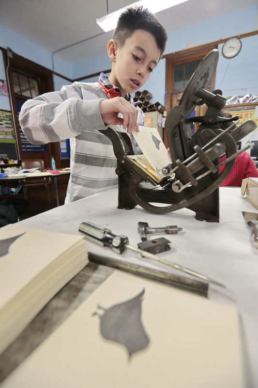 printmaking Published March 2, 2014 at 533 × 800 in Have Presses, Will Travel ← Previous Next → New Bedford Public Schools Artist Residency, photo credit Peter Pereira PHOTO PETER PEREIRA/The Standard-Times ++ Art professor Melanie Mowinski teaches Taylor School 5th graders the art of making prints using a print press machine.