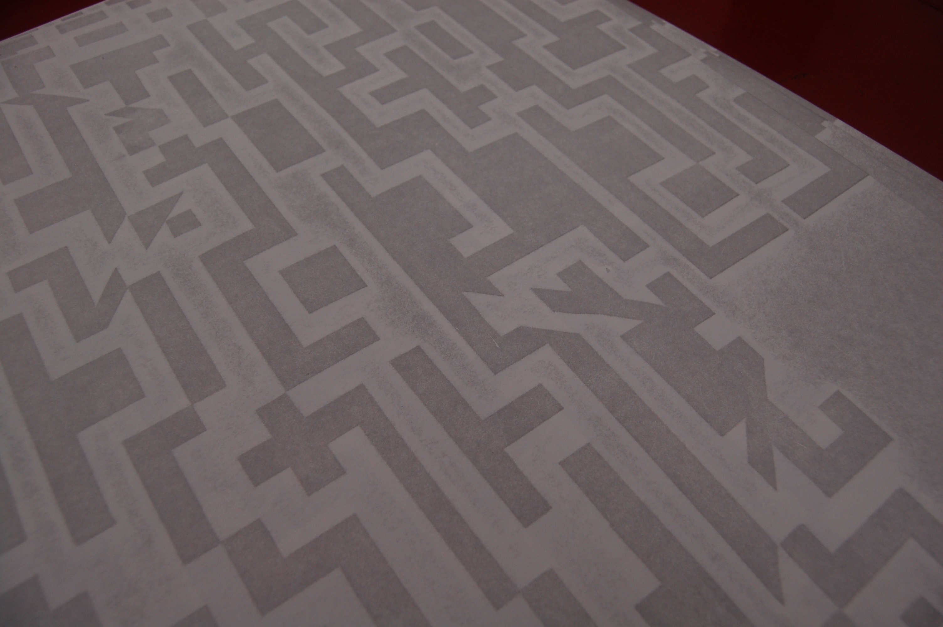 Intern Jonas has been working on his personal project, Oceania, these last couple of weeks. It’s a book that works as a maze. You turn the pages, tracing your way through until you get to the end. Of course, the structure of the book is sometimes called a “maze book.” These books are made on a single sheet that is folded up accordion style and cut at specific areas, creating various pockets and detours along the way. Jonas printed his maze using the pressure print method and cut various shapes of paper to create his matrix.