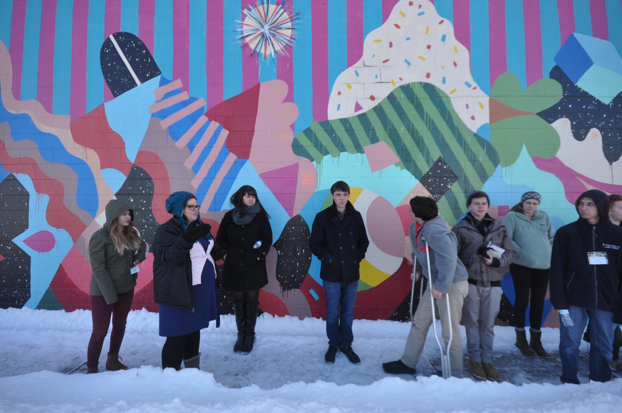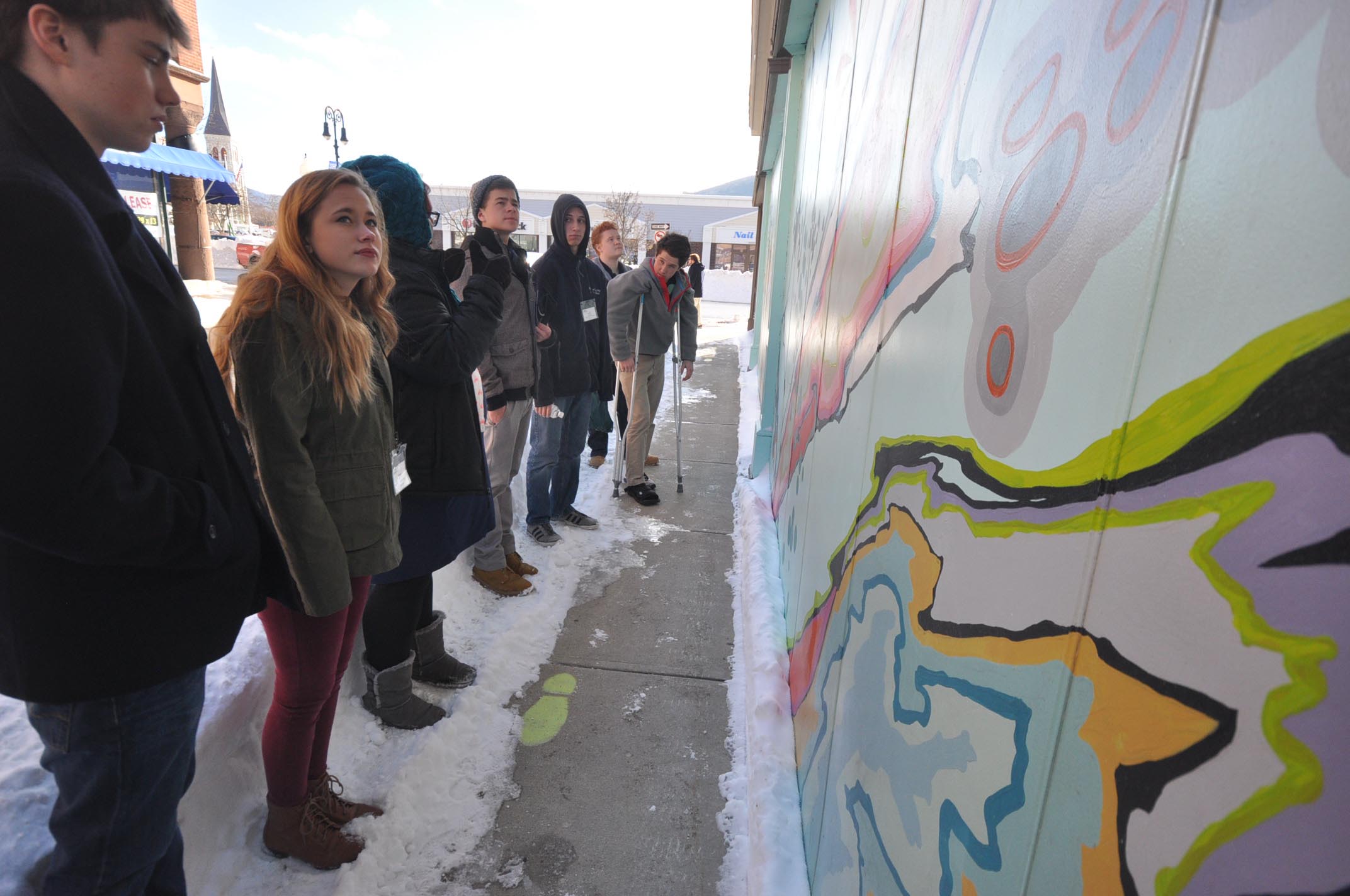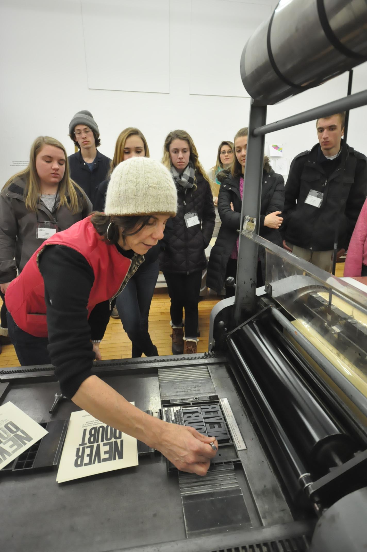 Tuesday February 3, 2015 PRESS Gallery was incredibly excited to be a part of the YOUth LEADership art crawl. The program of about thirty high school students came to PRESS as a part of their initiative to get involved and continue to cultivate the Berkshire area by interacting with the local artist community. Melanie really wanted to get across that PRESS Gallery would not be possible without years of collaboration. Massachusetts College of Liberal Arts is our primary supporter of what we do here on Main Street. PRESS started because of Down Street Art’s partnership with Scarfoni Realty which allowed us to move into a store front. And that funding from the Massachusetts Cultural Council, MCLA Faculty Creative Awards and the College Book Art Association was essential to our beginning. It was with this collaboration as well as support from our patrons that allow us to talk to groups and continue to create and grow!