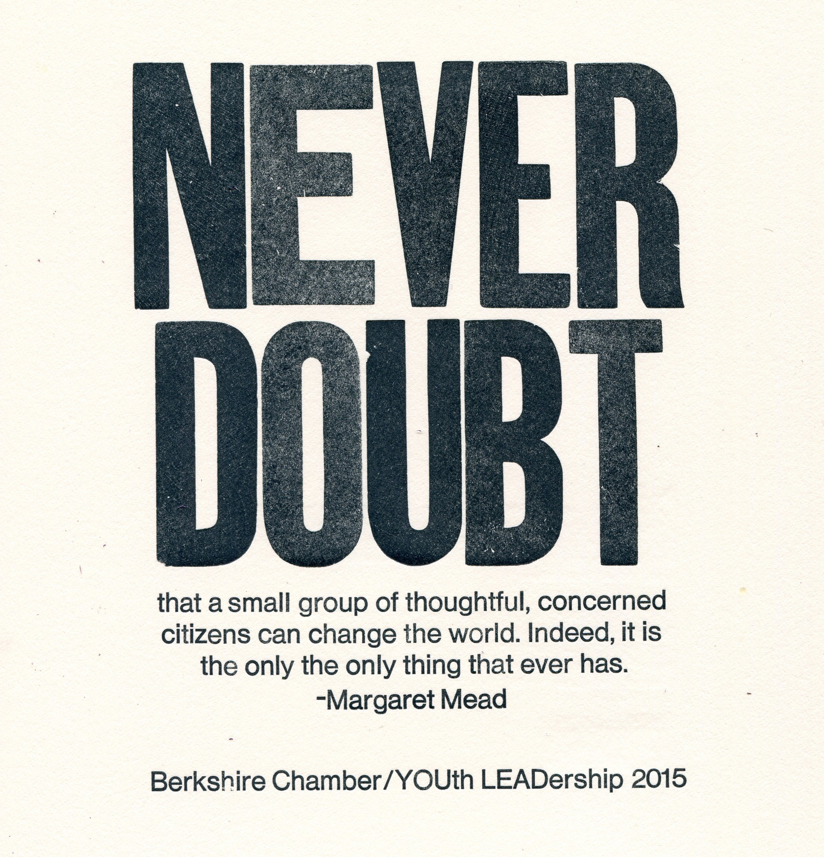 Later on she created a card to demonstrate what the press is able to do using the YOUth LEADership students to inspire the quote used. Using the words of Margret Mead “Never Doubt that a small group of thoughtful, concerned citizens can change the world. Indeed, it is the only thing that ever has” as their inspiration Melanie talked about some of the press terms such as minding your p and q, d and b and how leading actually refers to placing led in between lines. The only thing Melanie wish she caught sooner was the second repetition of “the only” found in the quote, saying “You will see that clearly someone did not have a good second reader in the proofreading department!”