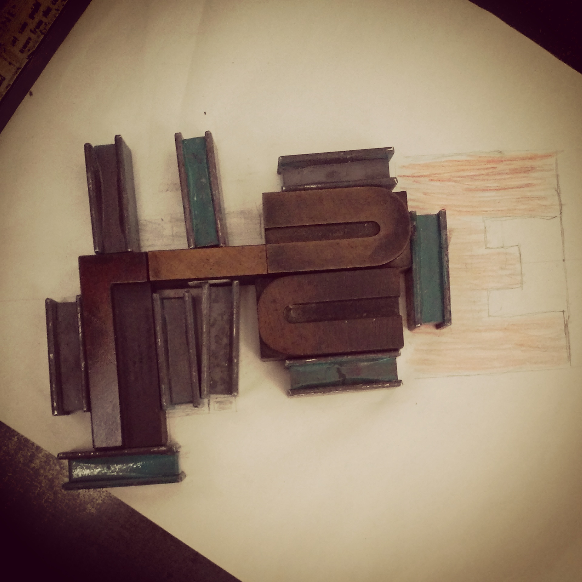 I have a couple of missions for the next couple of months at PRESS. One of them is to organize, by font, the woodtype drawers, which have been seven drawers of slapdash arrangement. Another mission is for me to create a series of prints every month to test and push by printing skills. For February, I’ll be experimenting with the woodtype to create abstract images that convey construction and movement, and also canonizes the quality these vintage, wood blocks create. I’m a little behind (I’ll blame the snow), but I like what I’ve done so far.