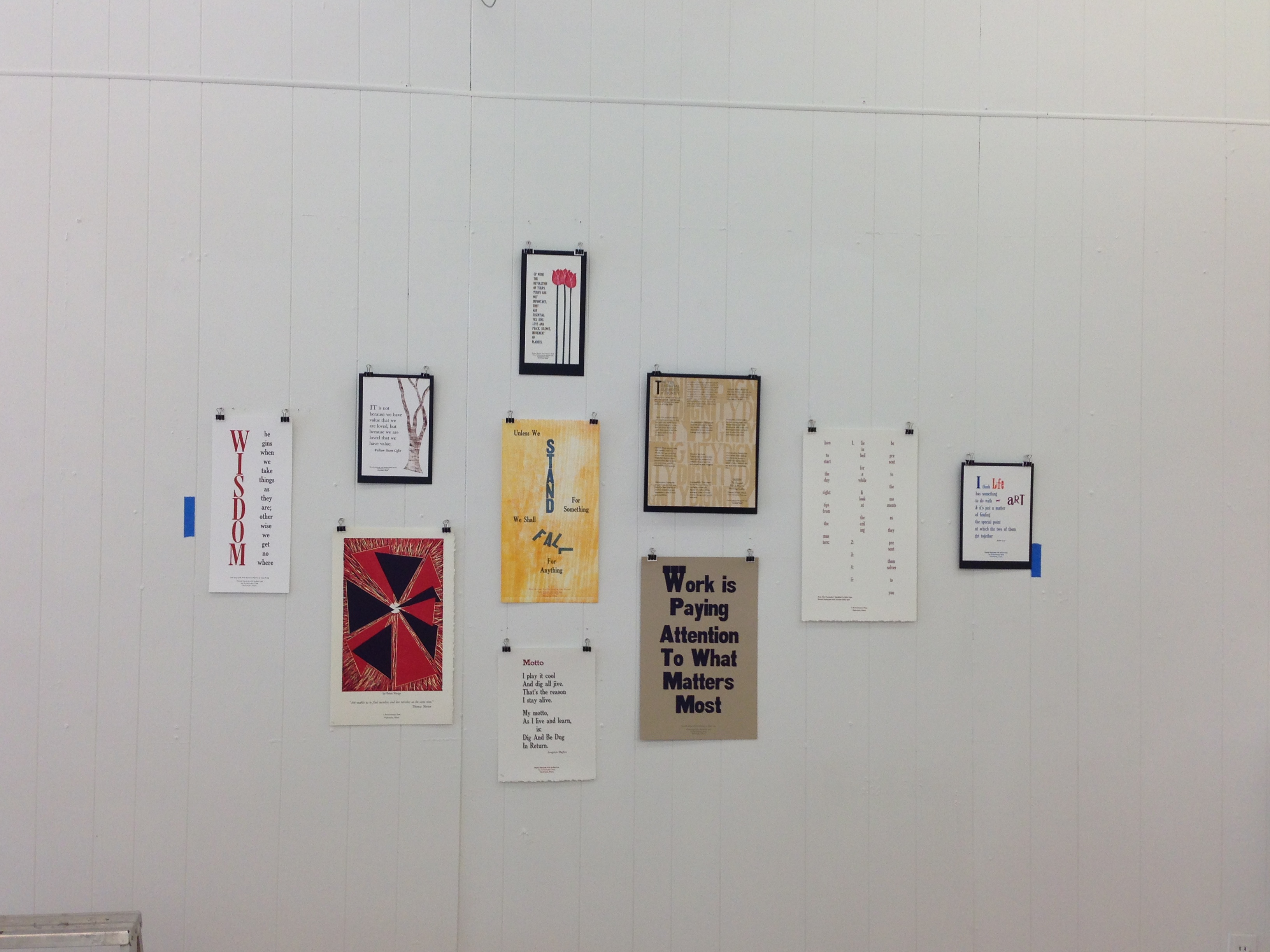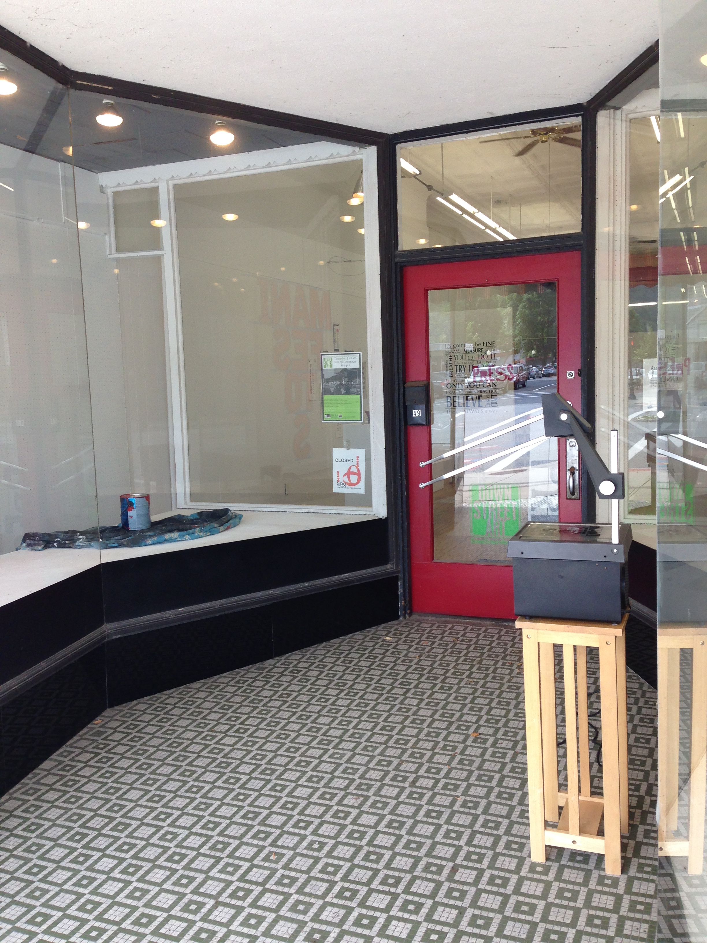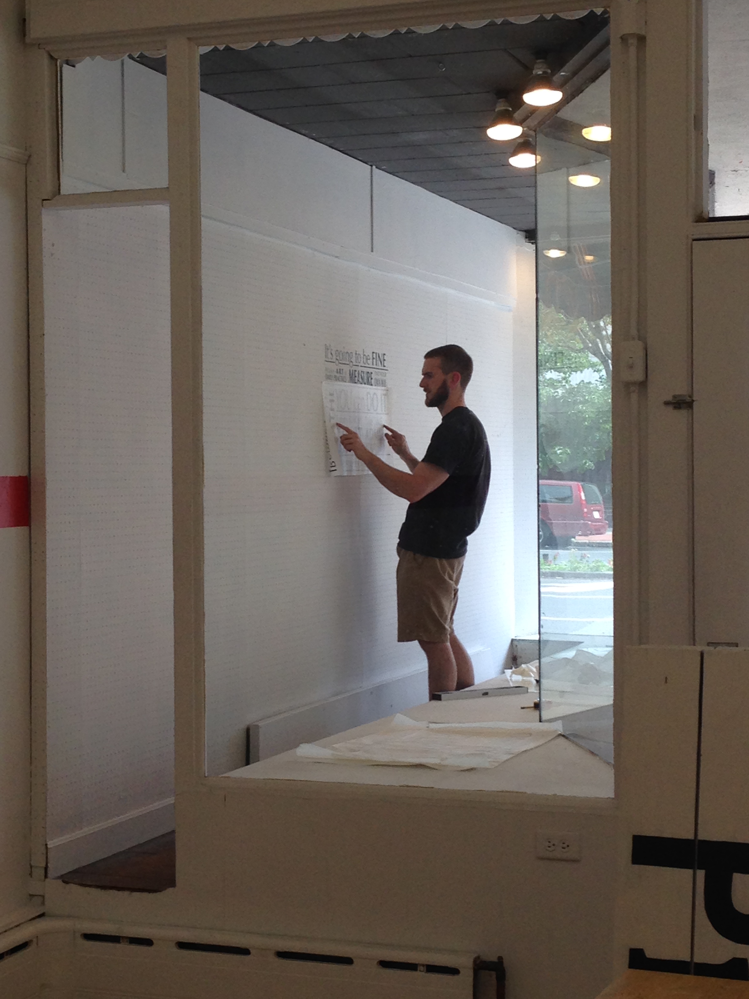It’s only Tuesday afternoon but it’s already been a super busy week installing Manifestos. We open Thursday for the DownStreet Art kickoff, but everyone has been in getting ready for the show! It’s been really fun working on every part of the process and even though I’ve installed before I’ve learned a lot from doing all the measuring (or lack thereof) myself. On Monday, I hung my first salon style grouping with a set of fantastic prints from A Revolutionary Press and realized when they were all hung that somewhere in the middle the spacing changed from 3 inches to 4 inches. With that lesson in mind I tried to be extra careful installing the opposite wall in a standard linear arrangement, especially since we have painted a big red stripe across it which makes uneven hanging really obvious! However, I (wrongly) assumed that all the clips we hang from were the same size, and some of my original measurements were a half inch too high. I have also become a blue tape ninja today while painting the MANIFESTOS design in the front window, while Jonas is installing TWO(!) super elaborate vinyl versions of the PRESS manifesto, I really don’t envy him… All in all we are running well on schedule and should meet our install goal of being done by 5 pm tomorrow!