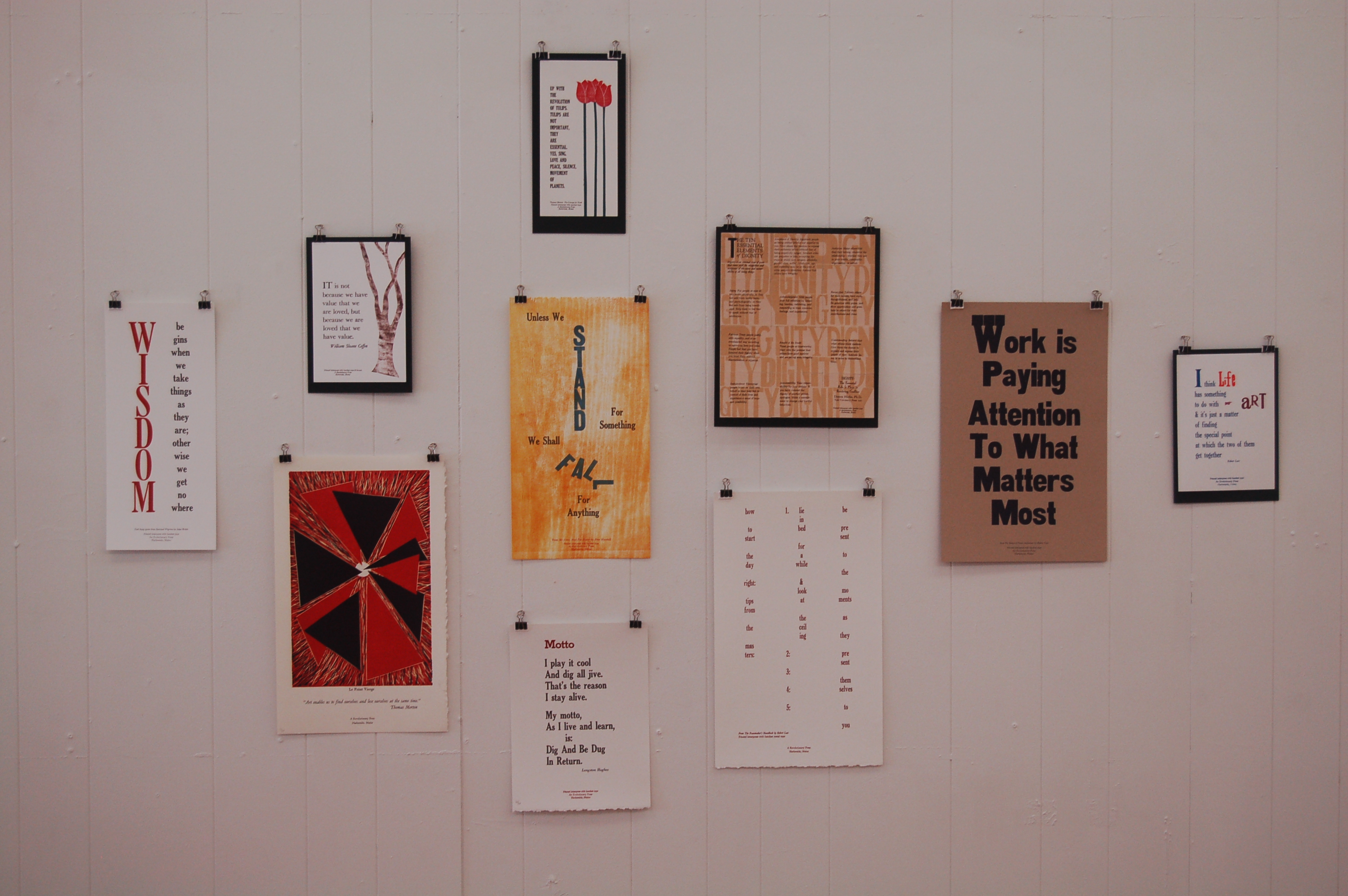 Vincents work expertly combines inspiring phrases and quotes with intriguing visual layouts. He explores color, shape, and text to create beautiful final products that are pleasing to the eye as well as the mind. He has ten prints on display in Manifestos and dominates the left wall. Come and check it out at the PRESS gallery on Main St through July 26.