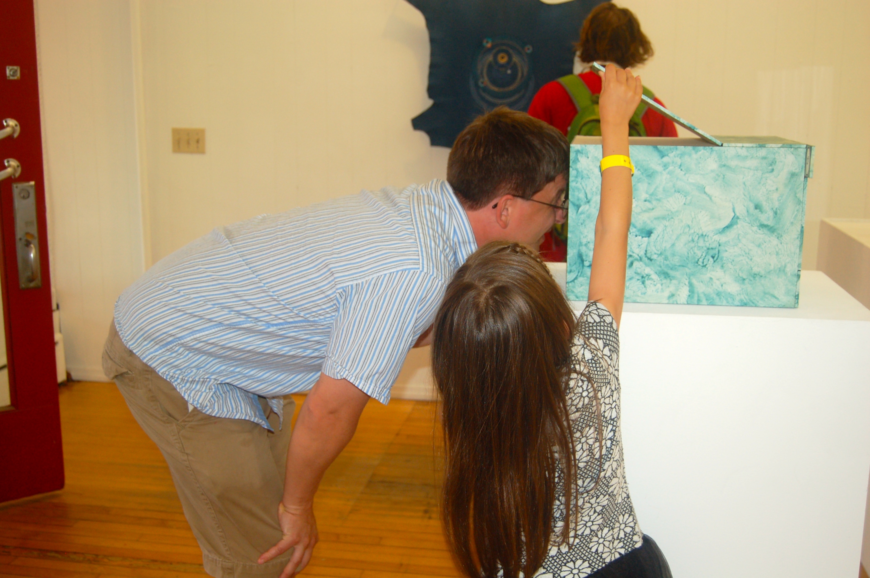 Our second show of the 2015 DownStreet Art season opened yesterday! We had a great turn out and a great time at the July DownStreet Art celebration. The artists,Erin Malkowski, Tara O’Brien, Erin Paulson, and Charissa Schulze, were inspired by a 1763 mathematics manuscript describing instructions for setting up a sundial, four artists respond to the drawing of the sundial. Each works with their own themes and interests to comment on time specifically in relation to the cosmos, family, documentation and historical vs. contemporary technology. It was great having them here this week to install their work and to celebrate the opening with them! Despite some technical difficulties, Jonas was able to print our monthly mantra card with the uplifting quote: